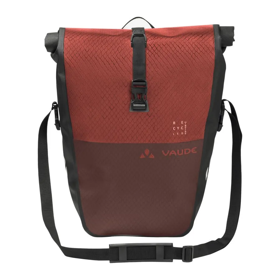 Fietsforenzen en fietsreizigers zullen dol zijn op deze fietstas voor achterop de fiets! Deze waterdichte achtertas is van gerecyclede materialen op de Duitse VAUDE-vestiging in de buurt van de Bodensee gemaakt. Hij laat zich dankzij de wikkelsluiting tot de benodigde maat comprimeren en absoluut dicht afsluiten. Voor veilig opbergen van kleine spullen of documenten zorgt een geïntegreerd binnenvak met ritssluiting. Deze enkele fietstas voor achterop de fiets is met een stabiele achterplaat uitgerust en wordt met het QMR 2.0-systeem stevig rechts of links op de bagagedrager bevestigd. De haken zijn met gebruiksvriendelijke draaiknoppen te verstellen. Met een klein hangslot (bijv. TSA-slot II) kan hij rechtstreeks op de QMR-haak worden vergrendeld. Met reflecterende elementen bedrukt. Levering: één enkele fietstas met 24 l volume, die op elke bagagedrager met ronde buizen (tot 16 mm diameter) kan worden bevestigd. De Aqua Back Single kan met deze praktische accessoiretassen worden aangevuld: SortYour Back, SortYour Business en Addita Bag. De afneembare schouderband maakt comfortabel over de schouder dragen mogelijk. De tas is met Eco Finish zonder fluorkoolwaterstoffen (PFC) milieuvriendelijk waterafstotend afgewerkt. Het VAUDE Green Shape-label staat voor een milieuvriendelijk, functioneel product van duurzame materialen.